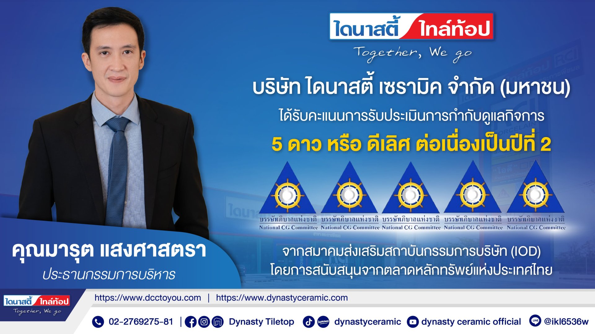 Dynasty Ceramic Public Company Limited (DCC) has received a 5-star rating, or Excellent CG Scoring, for corporate governance for the second consecutive year among companies with a market capitalization of over 10,000 million baht. This rating is given by the Thai Institute of Directors (IOD) with support from the Stock Exchange of Thailand (SET) under the 2024 Corporate Governance Report of Thai Listed Companies (CGR), with 808 companies participating in the survey.