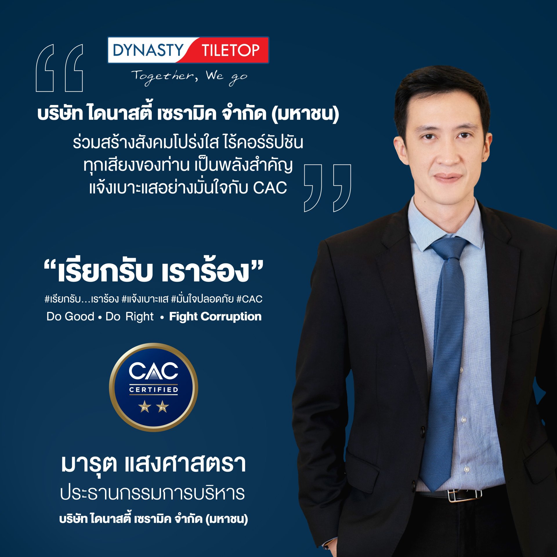 Dynasty Ceramic Public Company Limited, also known as DYNASTY TILETOP, reaffirms its commitment to transparency and good corporate governance by participating in the Thai Private Sector Collective Action Coalition Against Corruption (CAC). This initiative underscores the company's dedication to ethical business practices and its stance against corruption.